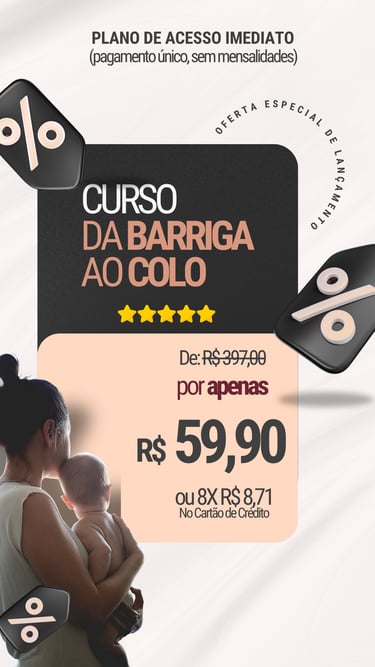 O sucesso na maternidade começa antes do parto, com o preparo certo, orientação clara sobre o enxoval, o parto, a amamentação (incluindo a pega correta) e os primeiros cuidados com o bebê nos dias mais delicados após o nascimento.